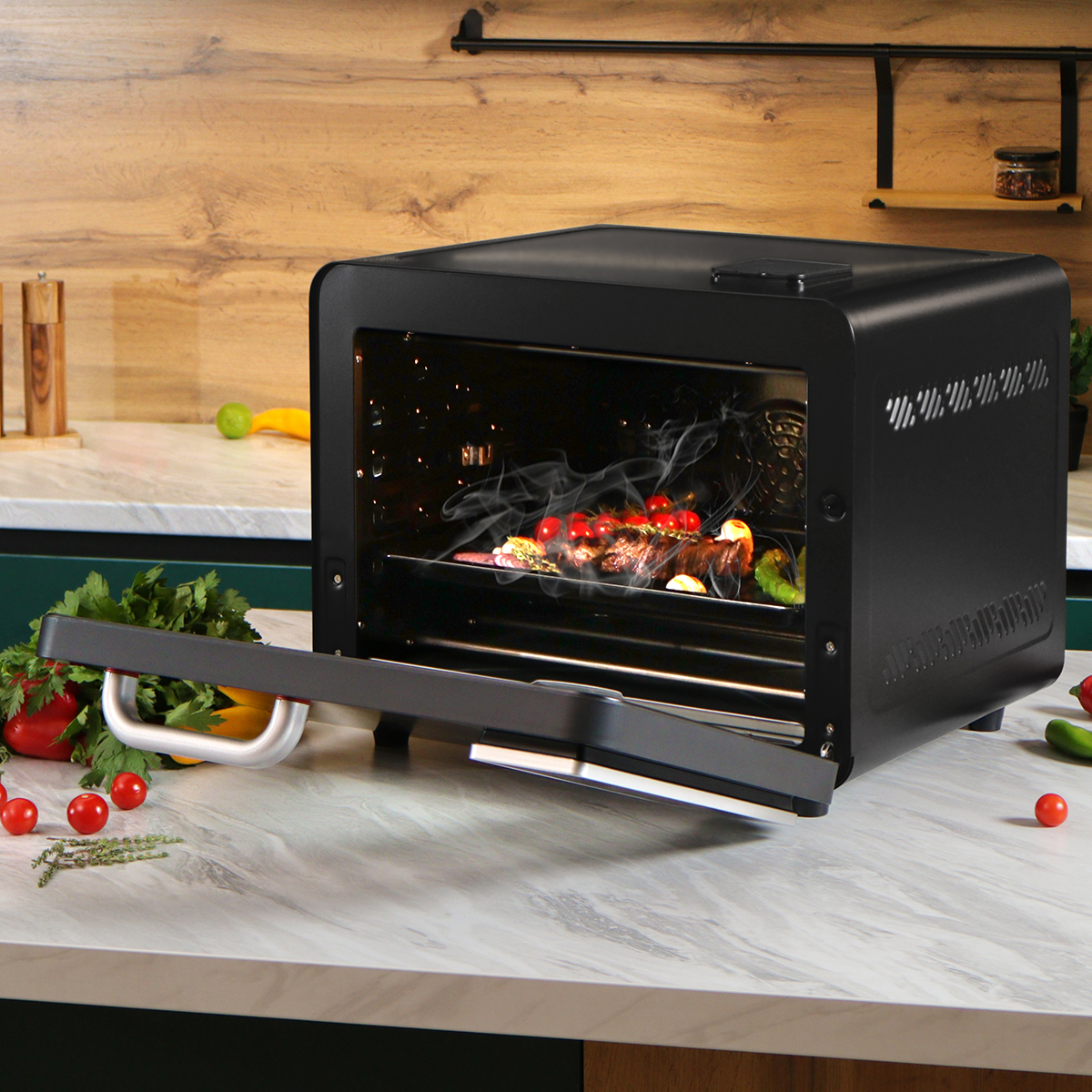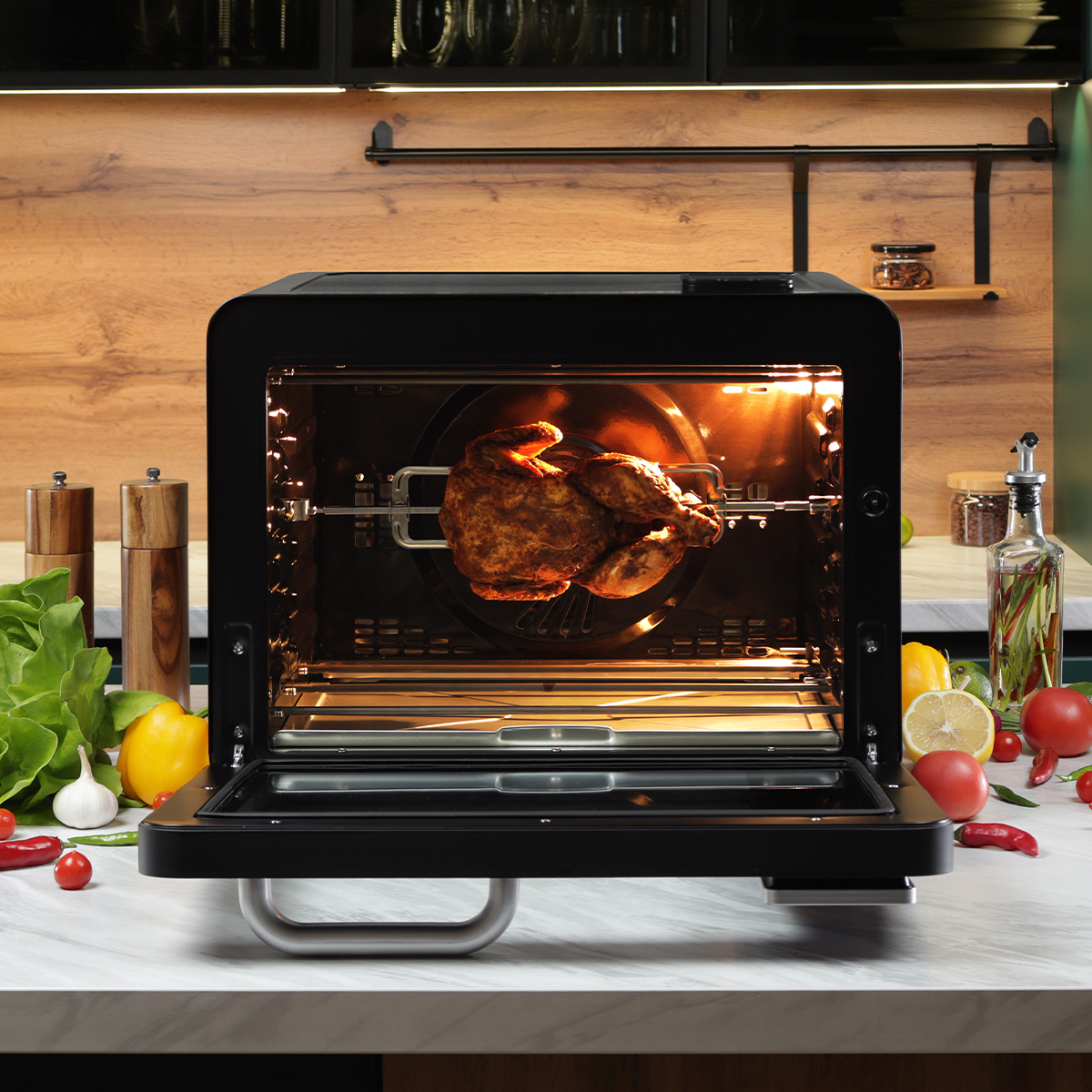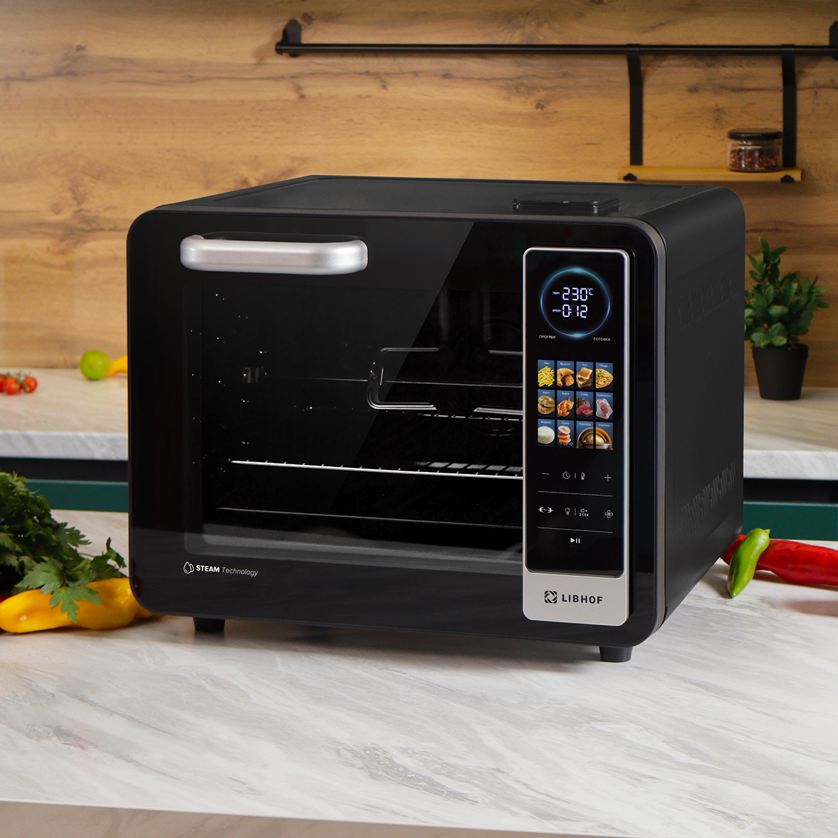 Аэрогриль-мультипечь оборудован просторной камерой объёмом 45 литров, выполненной с использованием высококачественного эмалевого антипригарного покрытия, которое обеспечивает долговечность и удобство в эксплуатации. Аэрогриль для дома имеет сенсорное управление с ярким цветным дисплеем, позволяющим легко настраивать параметры приготовления, а функциональный таймер даёт возможность установить время работы вплоть до 9 часов.