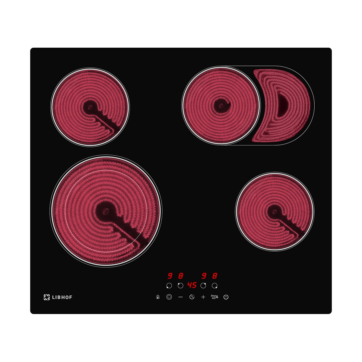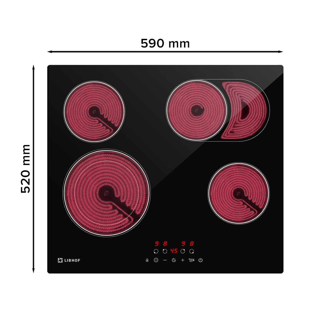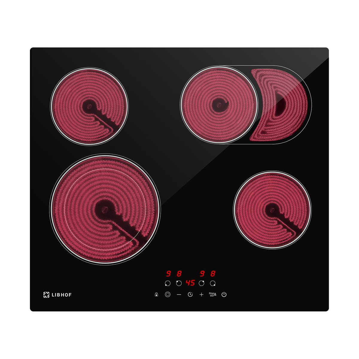Встраиваемая электрическая варочная панель Libhof CT-604C — практичное решение для современной кухни, которое идеально подходит для ежедневного использования. Эта электрическая варочная панель с 4 конфорками имеет две расширенные зоны нагрева, одна из которых с овальным расширением, что обеспечивает оптимальное распределение тепла под различную посуду.