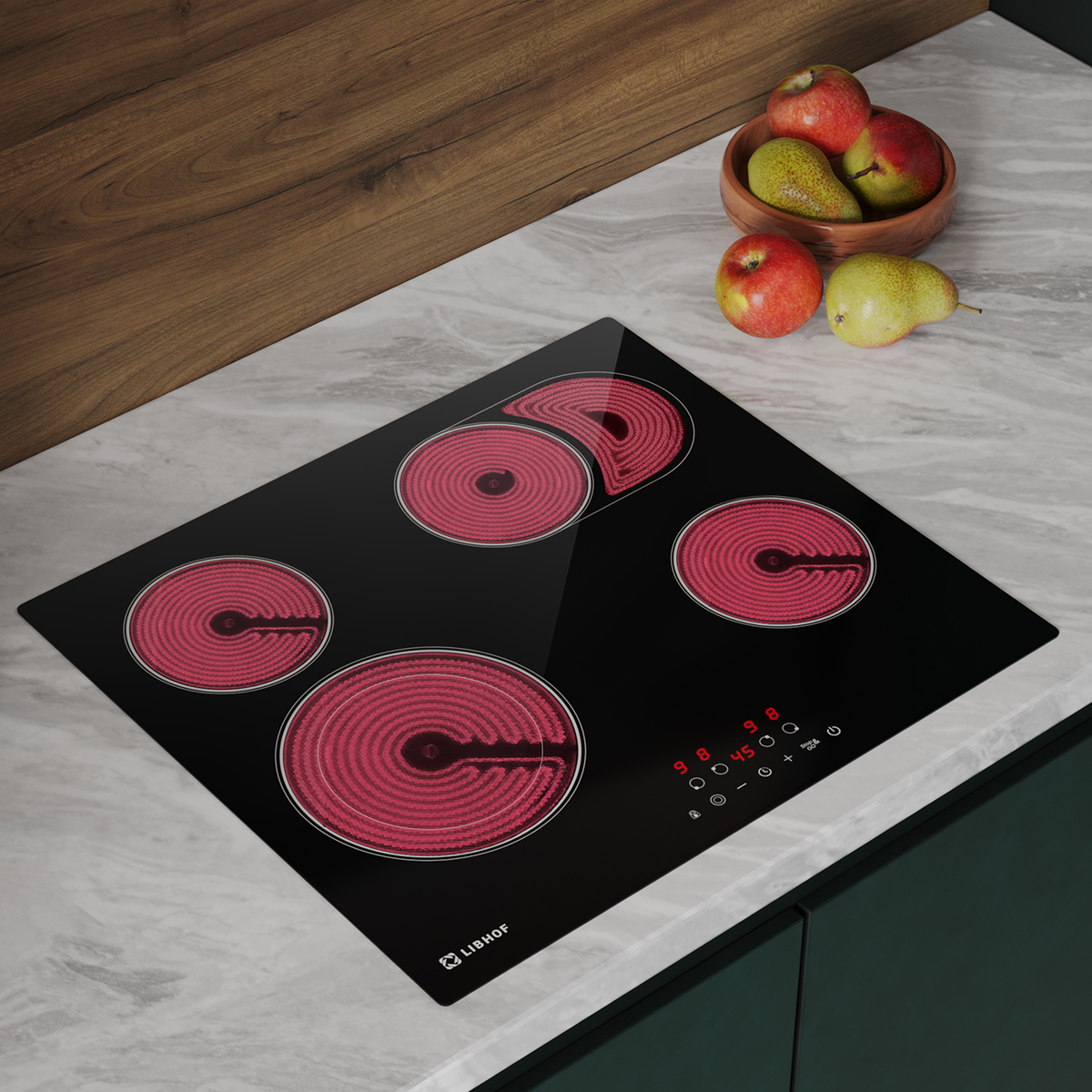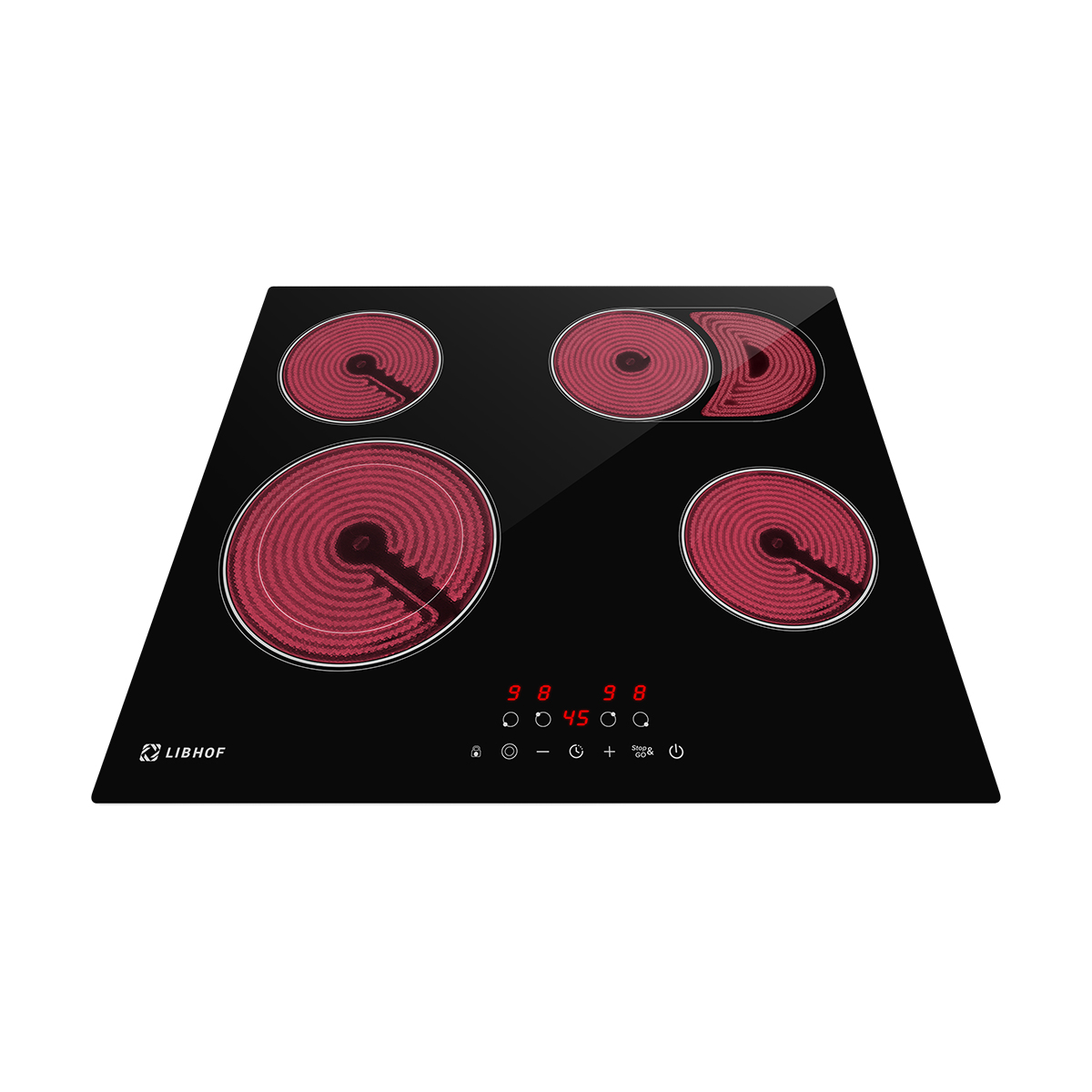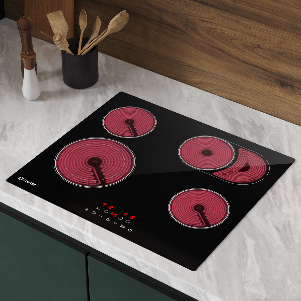 Встраиваемая электрическая варочная панель Libhof CT-604C — практичное решение для современной кухни, которое идеально подходит для ежедневного использования. Эта электрическая варочная панель с 4 конфорками имеет две расширенные зоны нагрева, одна из которых с овальным расширением, что обеспечивает оптимальное распределение тепла под различную посуду.