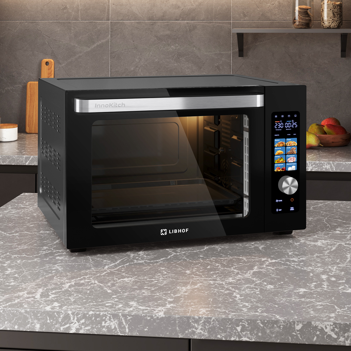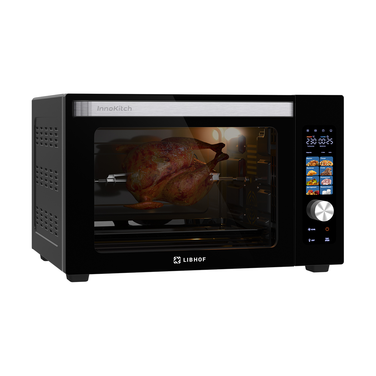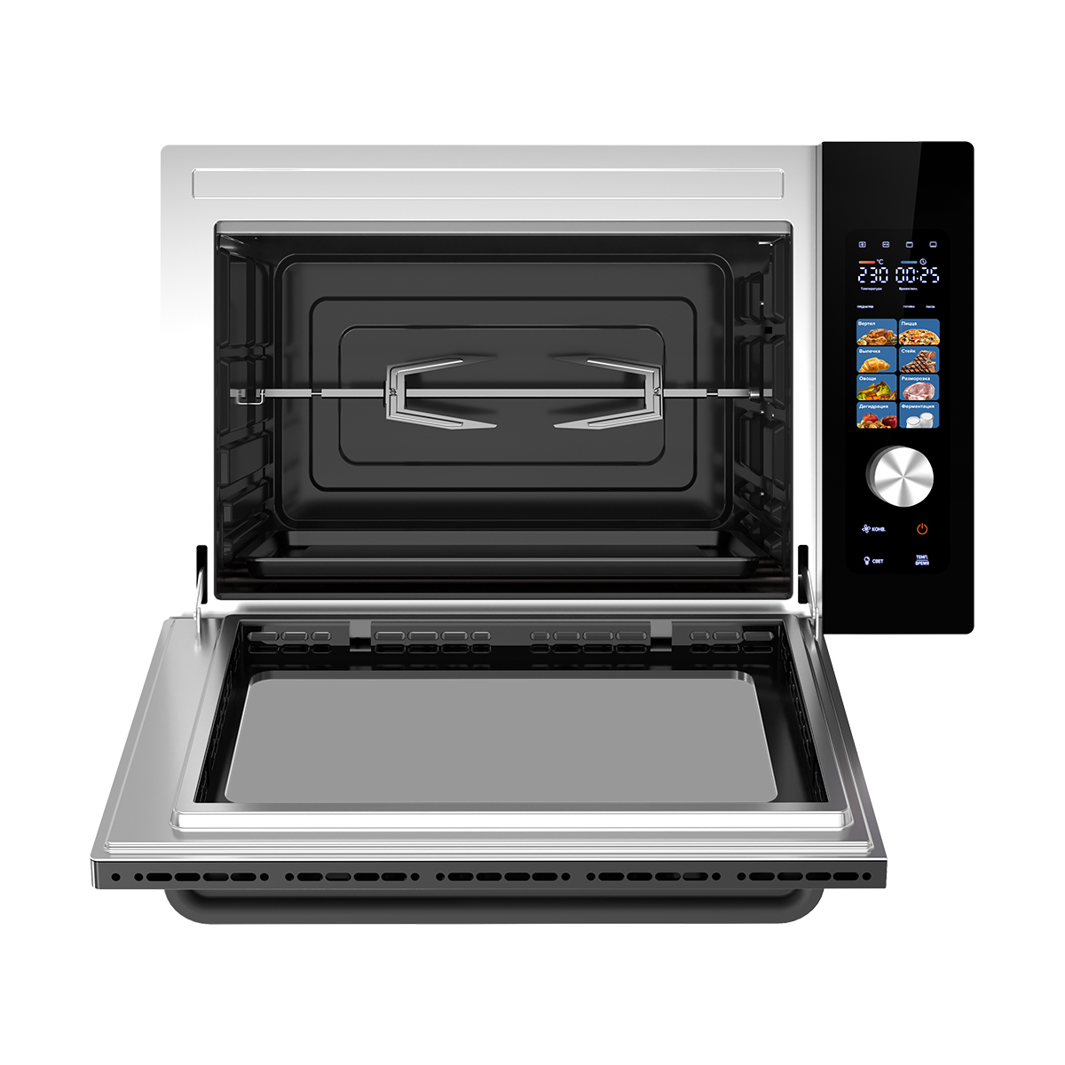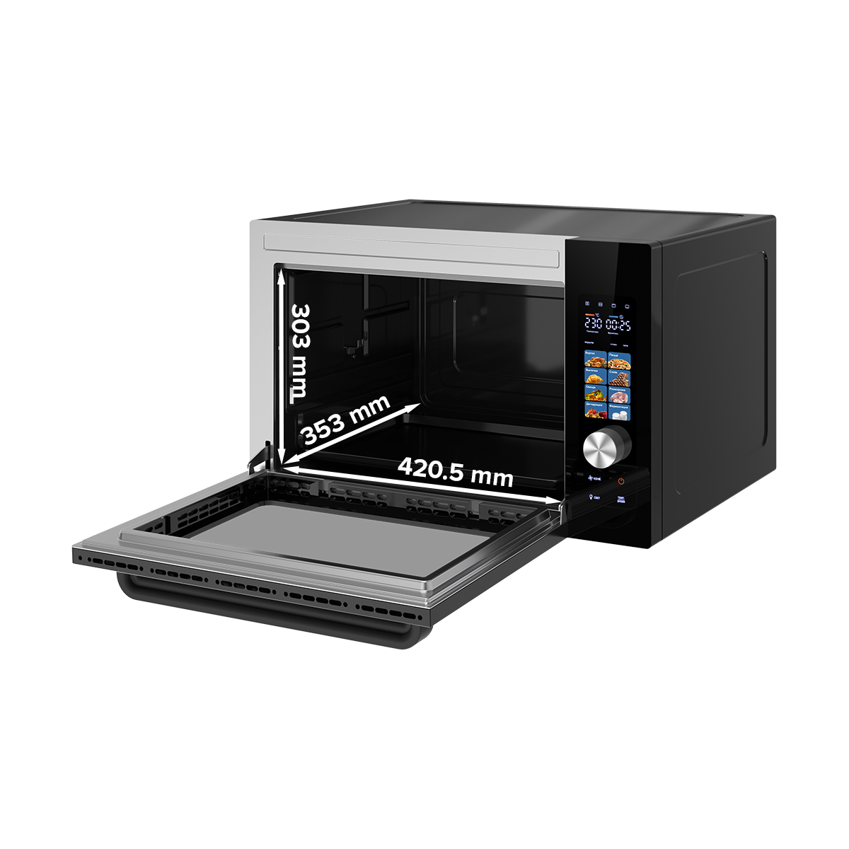 В камере двойное антипригарное покрытие, которое упрощает уход за поверхностью, а два жаропрочных стекла на дверце обеспечивают отличный обзор содержимого без риска обжечься и снижают потерю тепла. Устройство оснащено подсветкой камеры, цветным дисплеем для удобного управления и звуковым таймером, что позволяет точно контролировать процесс приготовления.