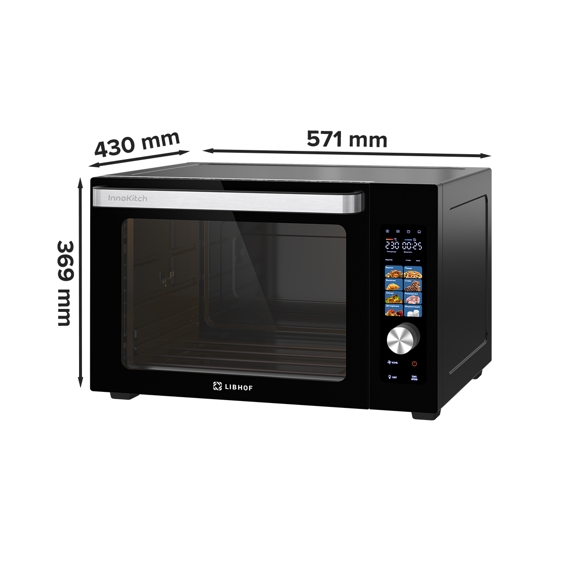 Настольная мини‑печь представлена в стильном черном цвете, благодаря чему органично впишется в любой кухонный интерьер. Допустимая максимальная нагрузка на аксессуары: вращающаяся корзина – не более 0,5 кг, набор для гриля, противень, решетка- не более 3,5 кг.