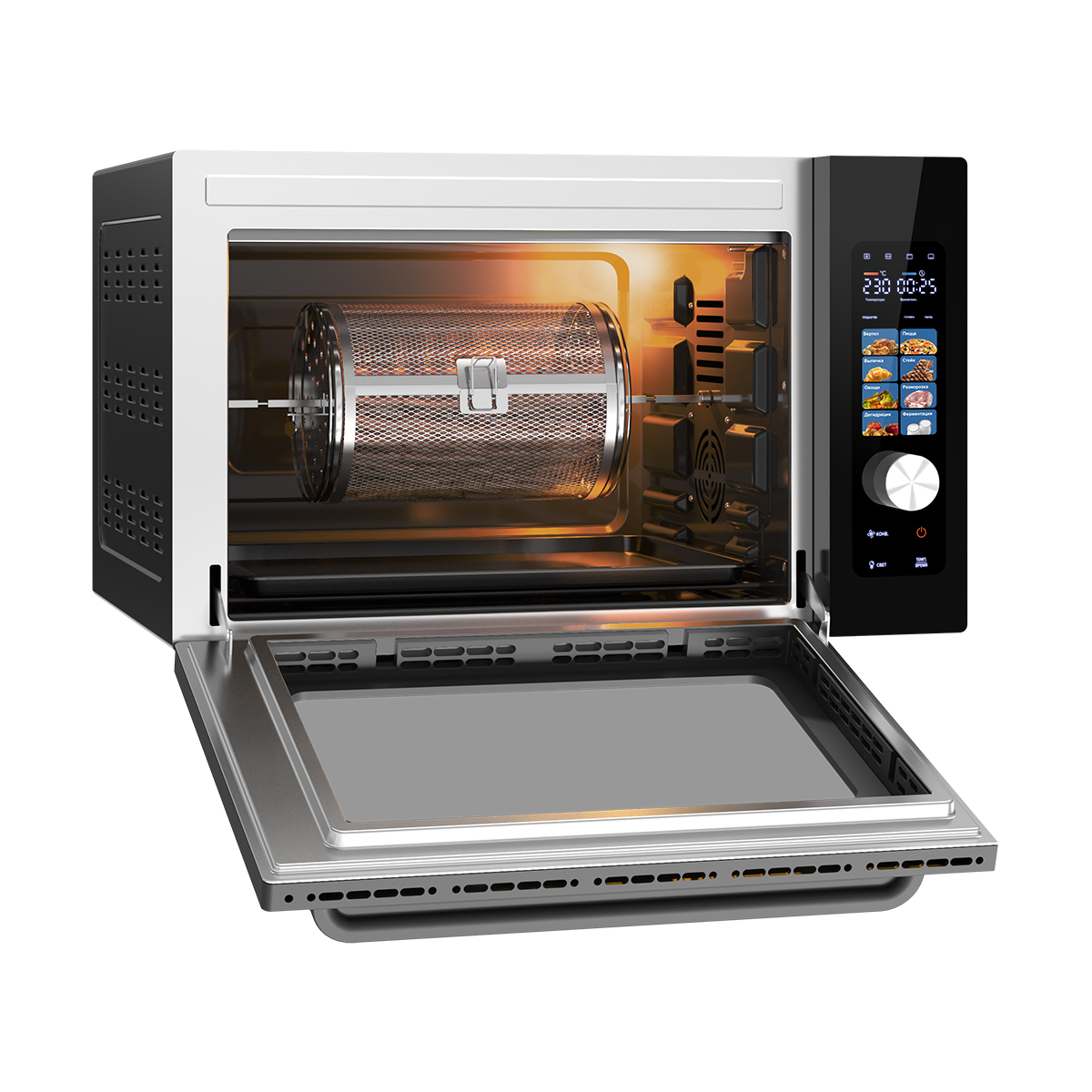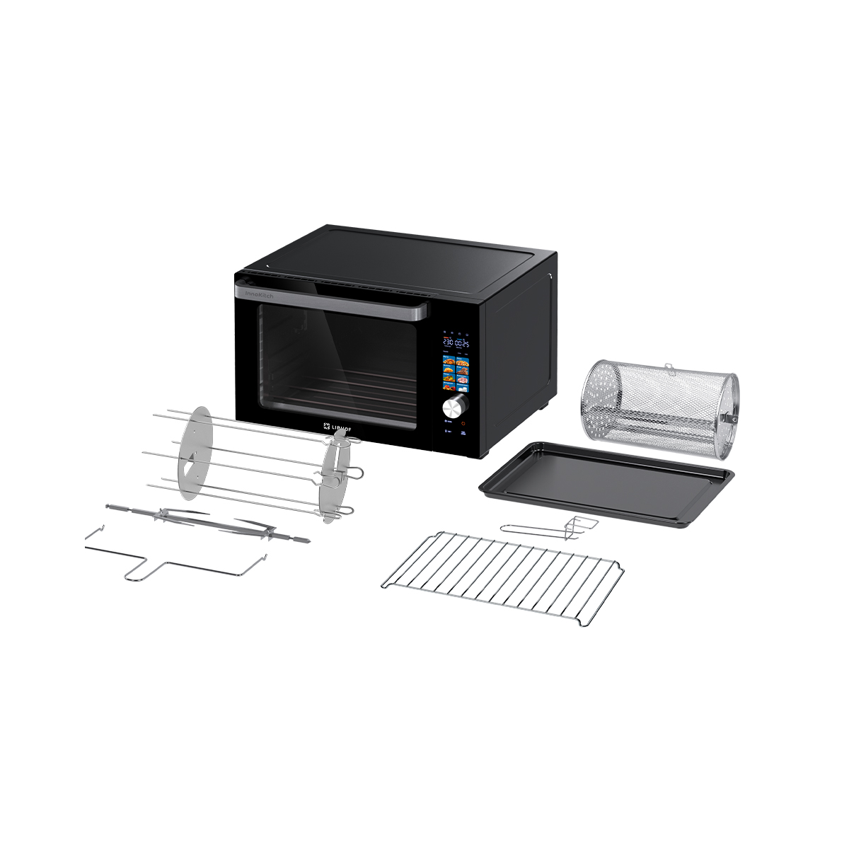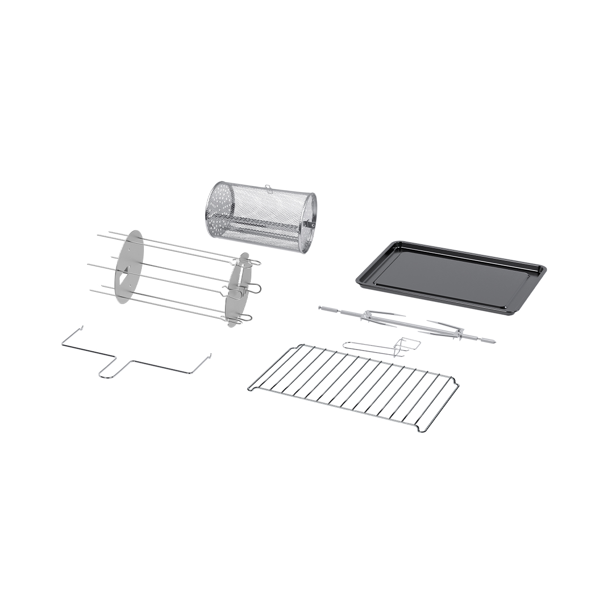 мини-печь, вертел, съемник вертела, ручка для противня, противень, решетка, вращающаяся корзина, шашлычница, поднос для крошек, инструкция, книга рецептов |