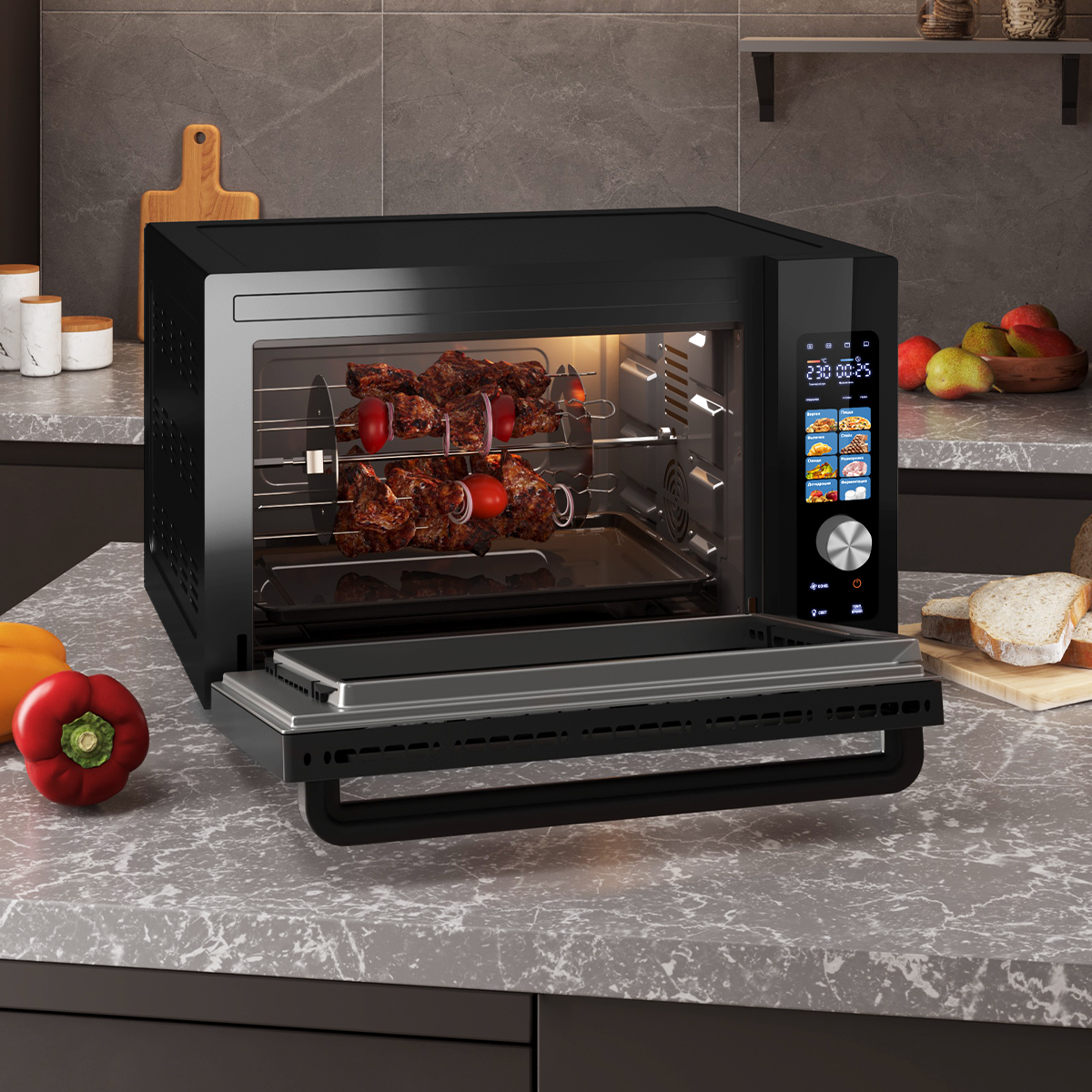 Мини-печь с конвекцией мощностью 1800 Вт и 8 нагревательными элементами, позволяет быстро подрумянить блюда, благодаря равномерной теплопередаче, и обеспечивает идеальное пропекание без пересушивания.