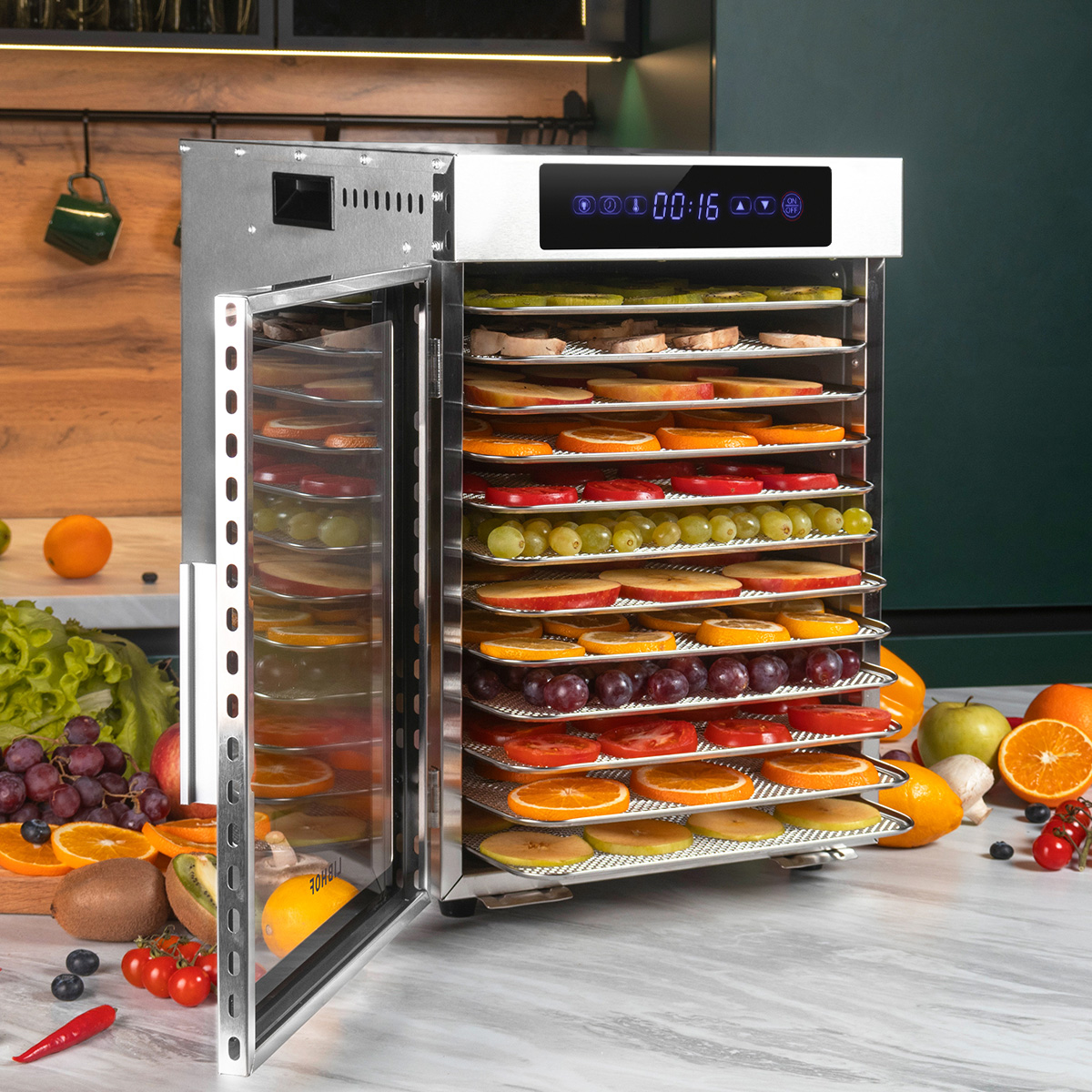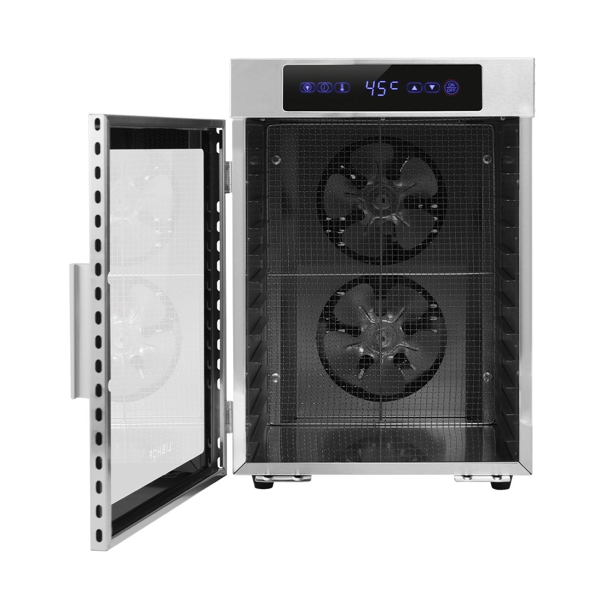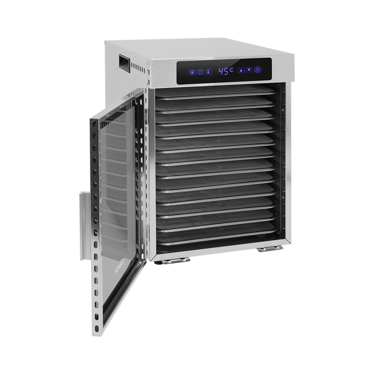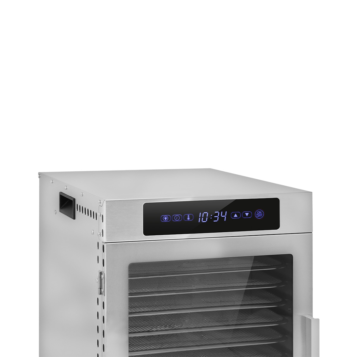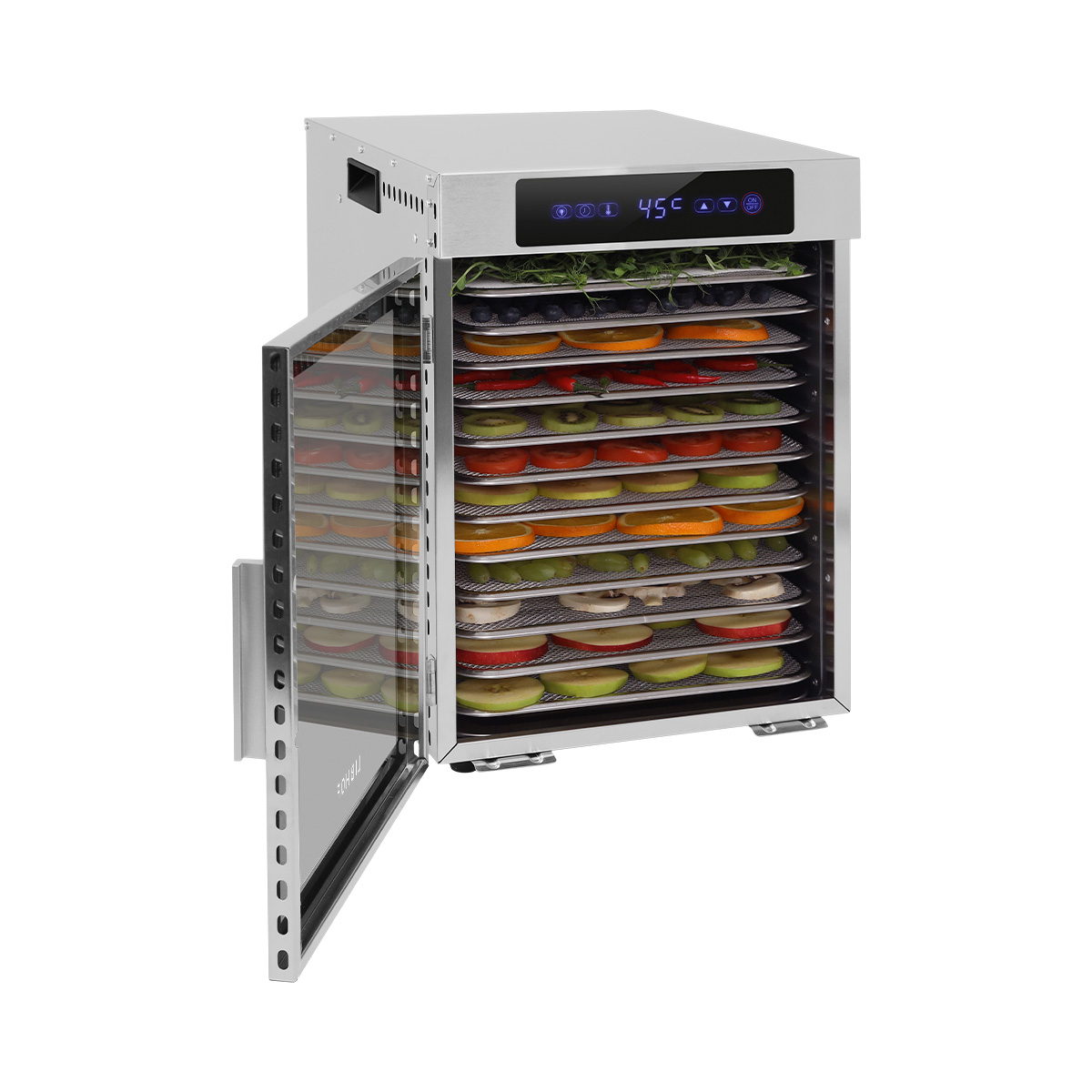 Дегидратор для овощей в металлическом корпусе оснащен электронным управлением и мощностью 800 Вт, имеет регулировку температуры от 20 до 90 градусов, что позволяет выбрать оптимальный режим для каждого типа продуктов.