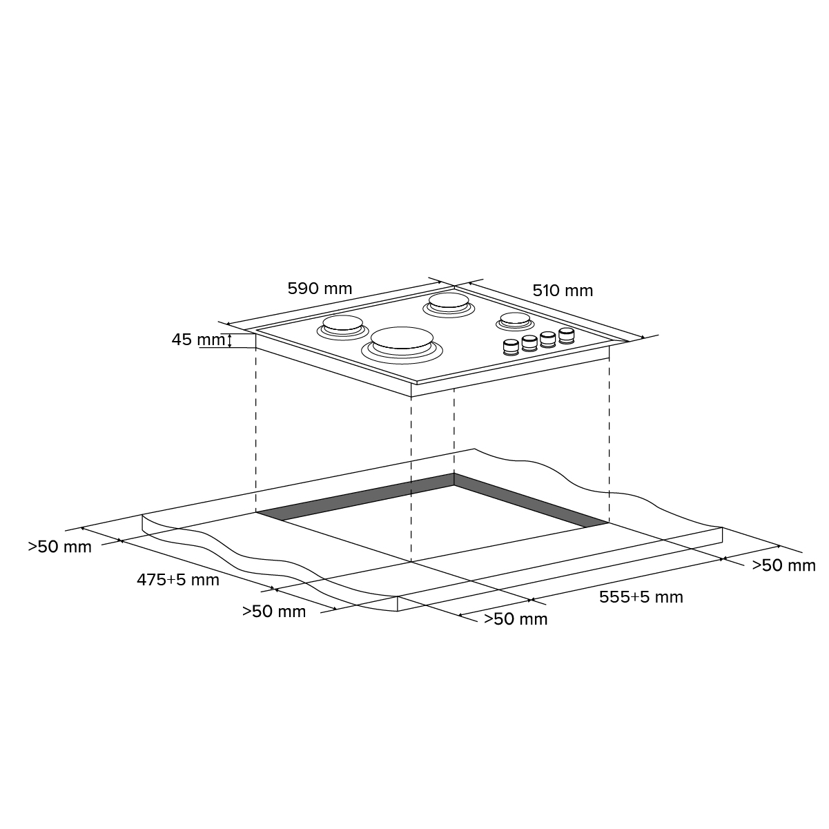 Рабочая поверхность газовой варочной панели выполнена из прочного закаленного стекла черного матового цвета, что придает современный вид и обеспечивает высокую устойчивость к температурным перепадам и царапинам. Чугунная решетка для конфорок гарантирует высокую прочность и долговечность, особенно при интенсивном использовании. Механическое управление с использованием термостойких ручек позволяет удобно и безопасно регулировать мощность нагрева.